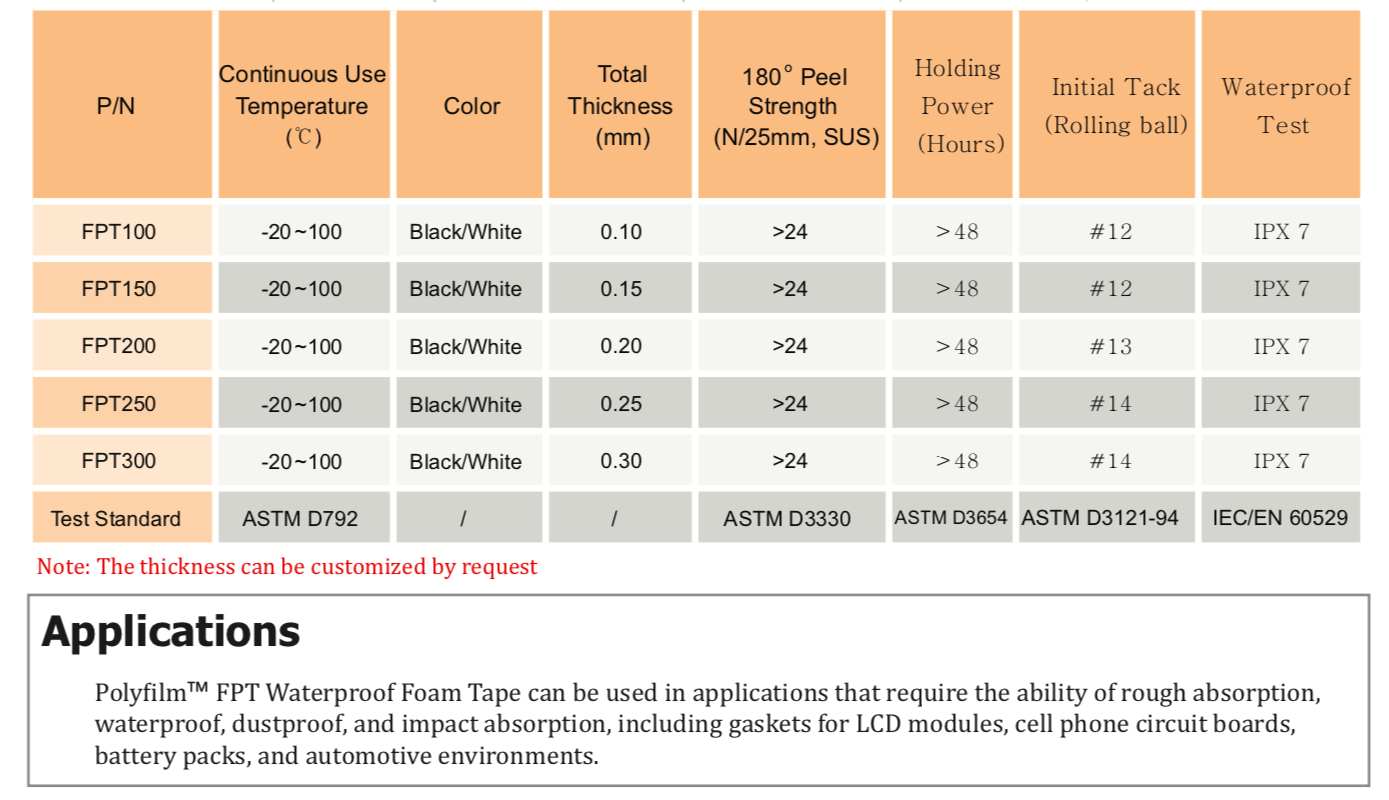 TM FPT 系列泡棉膠帶是一種雙面膠帶,由特定的聚乙烯泡棉和丙烯酸粘合劑組成。這種防水泡棉膠帶由于其微觀和獨立的細(xì)胞結(jié)構(gòu)而非常薄和柔軟。它具有高的沖擊吸收能力、出色的防水性能和回彈性。" />